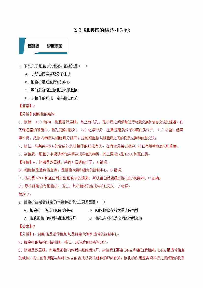 3.3 细胞核的结构和功能(解析版)