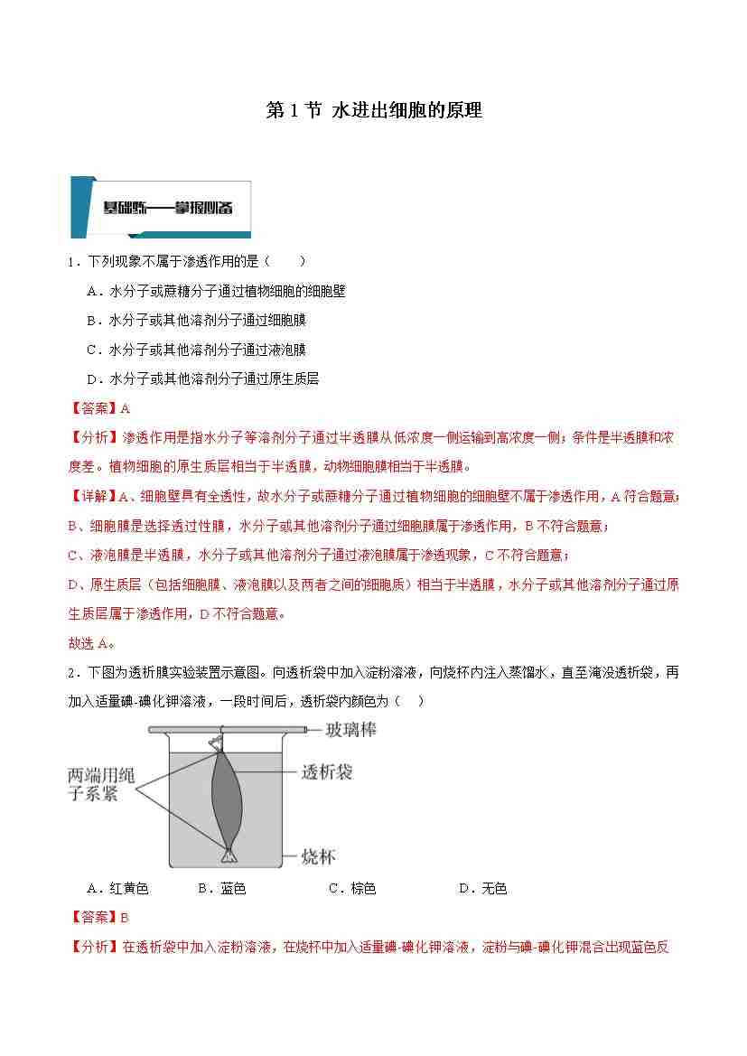 4.1 水进出细胞的原理(解析版)