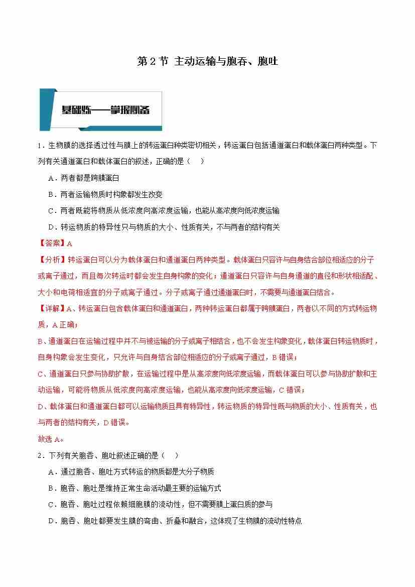 4.2 主动运输与胞吞、胞吐(解析版)
