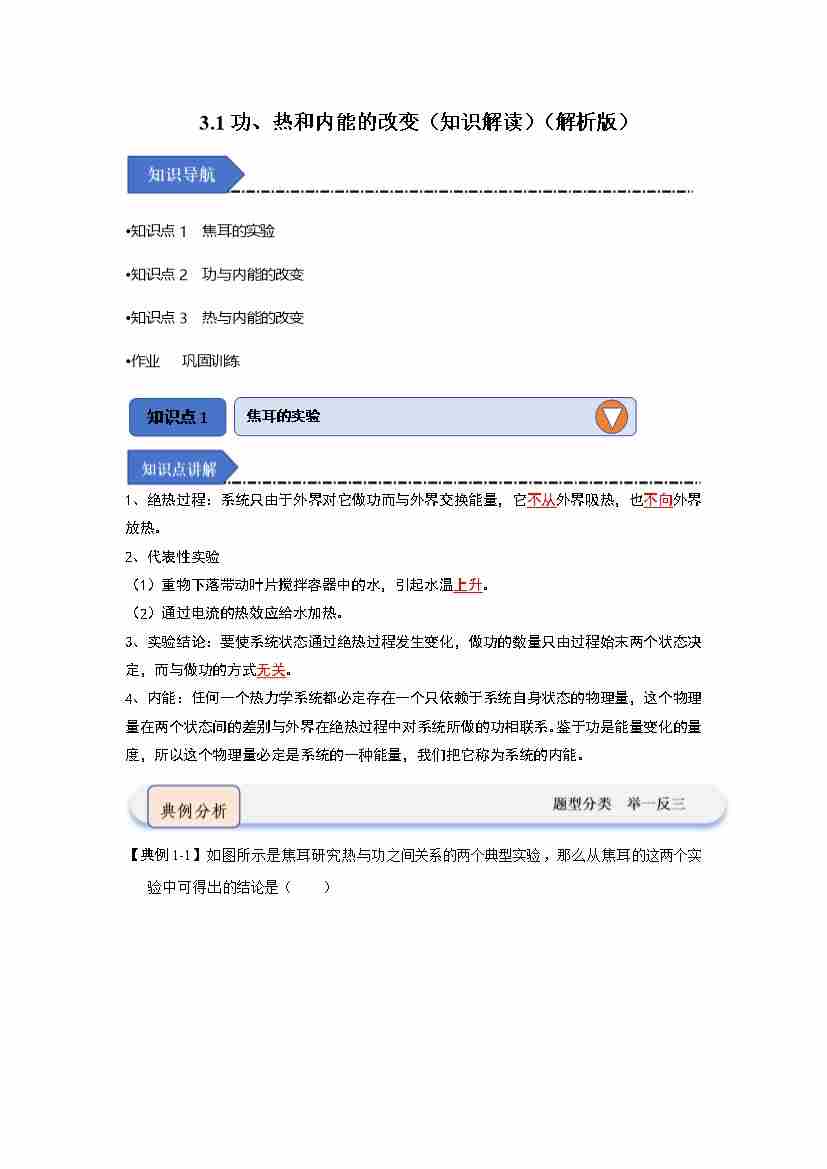 3.1功、热和内能的改变(知识解读)(教师版)