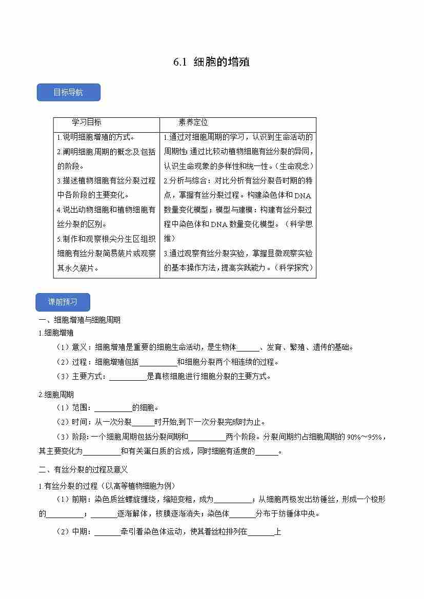 6.1 细胞的增殖 人教版必修1)教师版