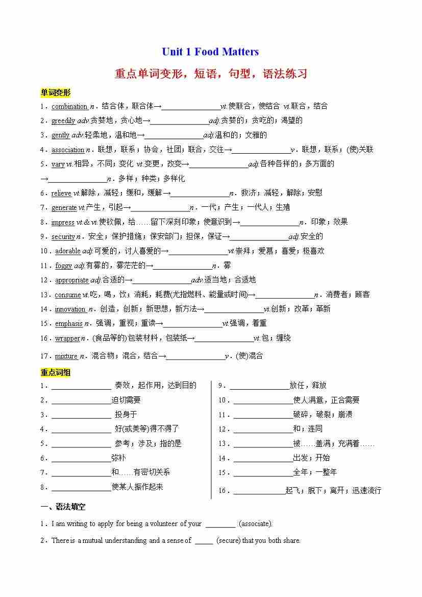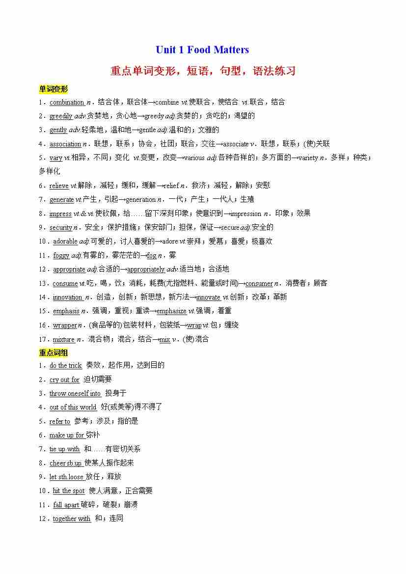 Unit 1 Food Matters 重点单词变形,短语,句型,语法练习(原卷版)
