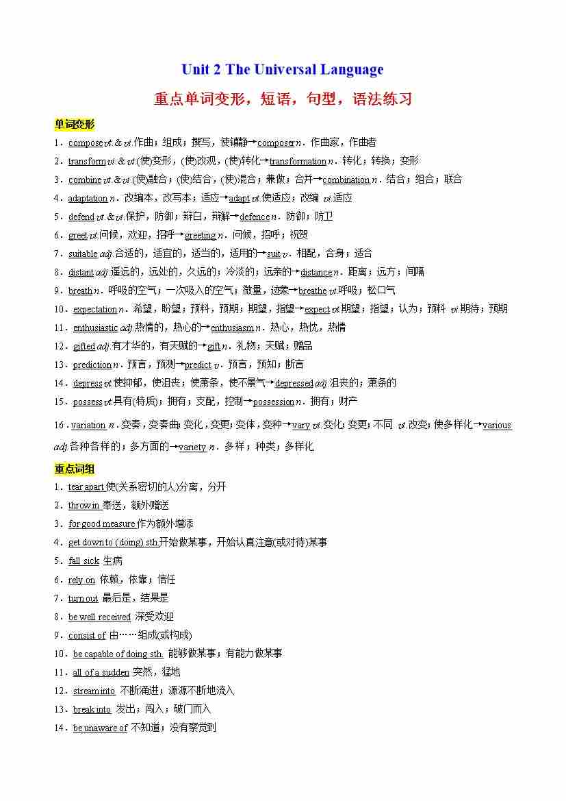 Unit 2 The Universal Language重点单词变形,短语,句型,语法练习(解析版)