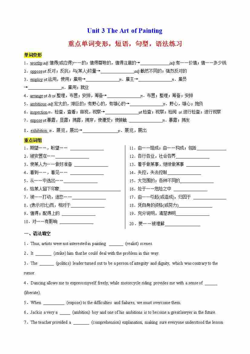 Unit 3 The Art of Painting重点单词变形,短语,句型,语法练习(原卷版)