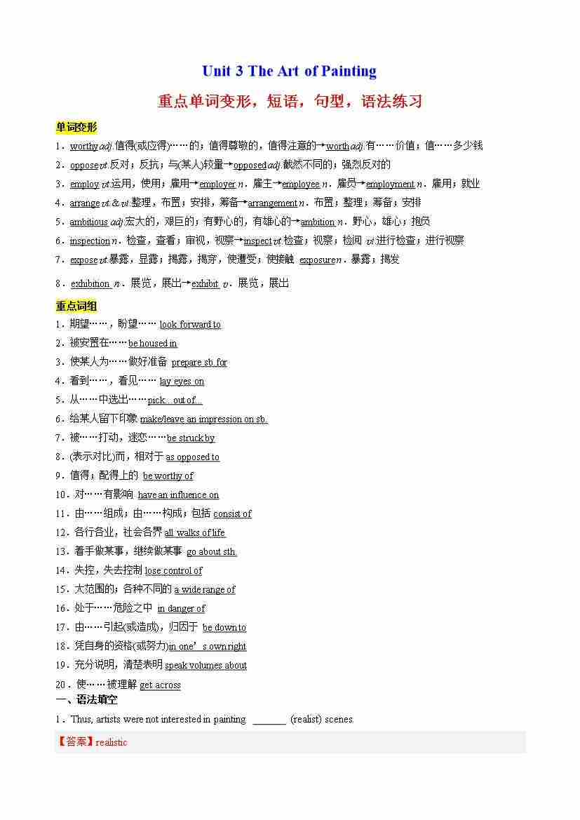 Unit 3 The Art of Painting重点单词变形,短语,句型,语法练习(解析版)