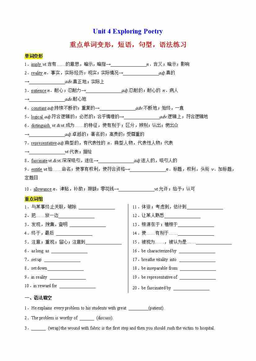 Unit 4 Exploring Poetry重点单词变形,短语,句型,语法练习(原卷版)