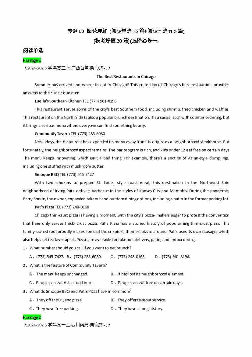 专题03 阅读理解(阅读单选15篇、阅读七选五5篇)(模考好题20篇)(译林版2020)(学生版)