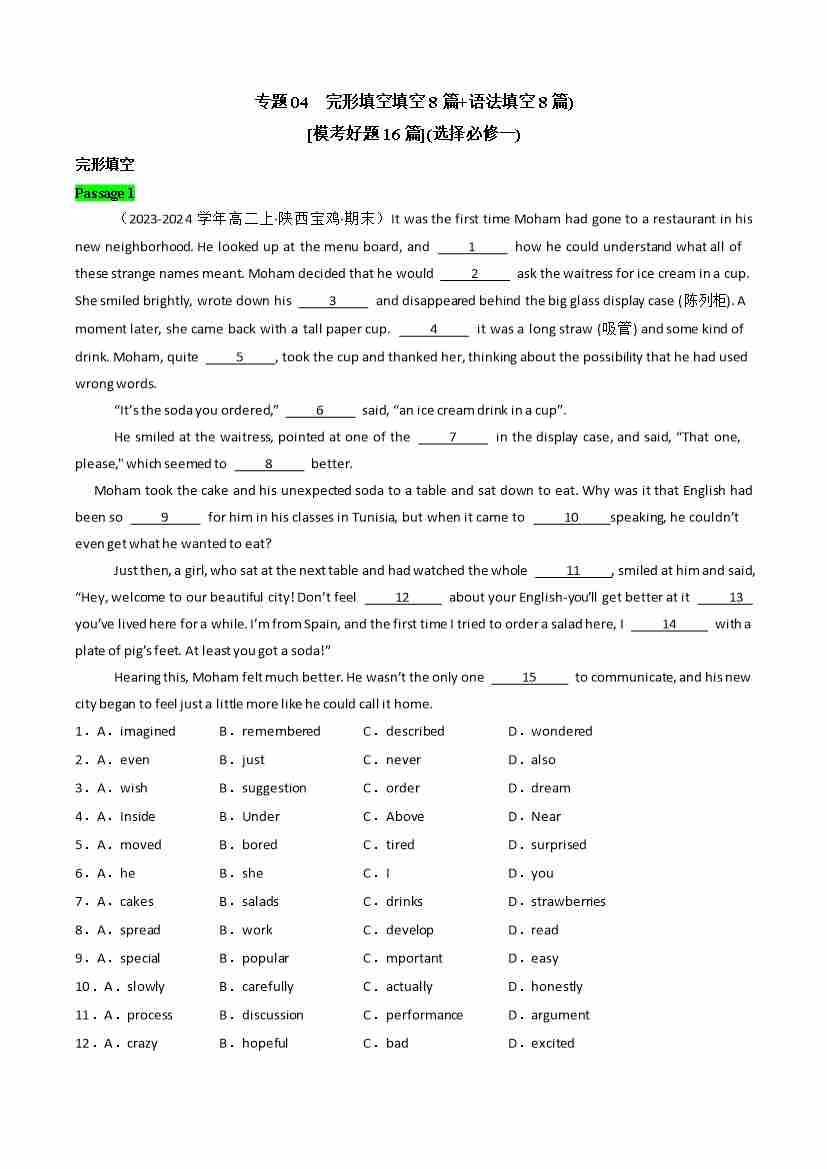 专题04 完形填空8篇(15空)、语法填空8篇(模考好题16 篇)(学生版)