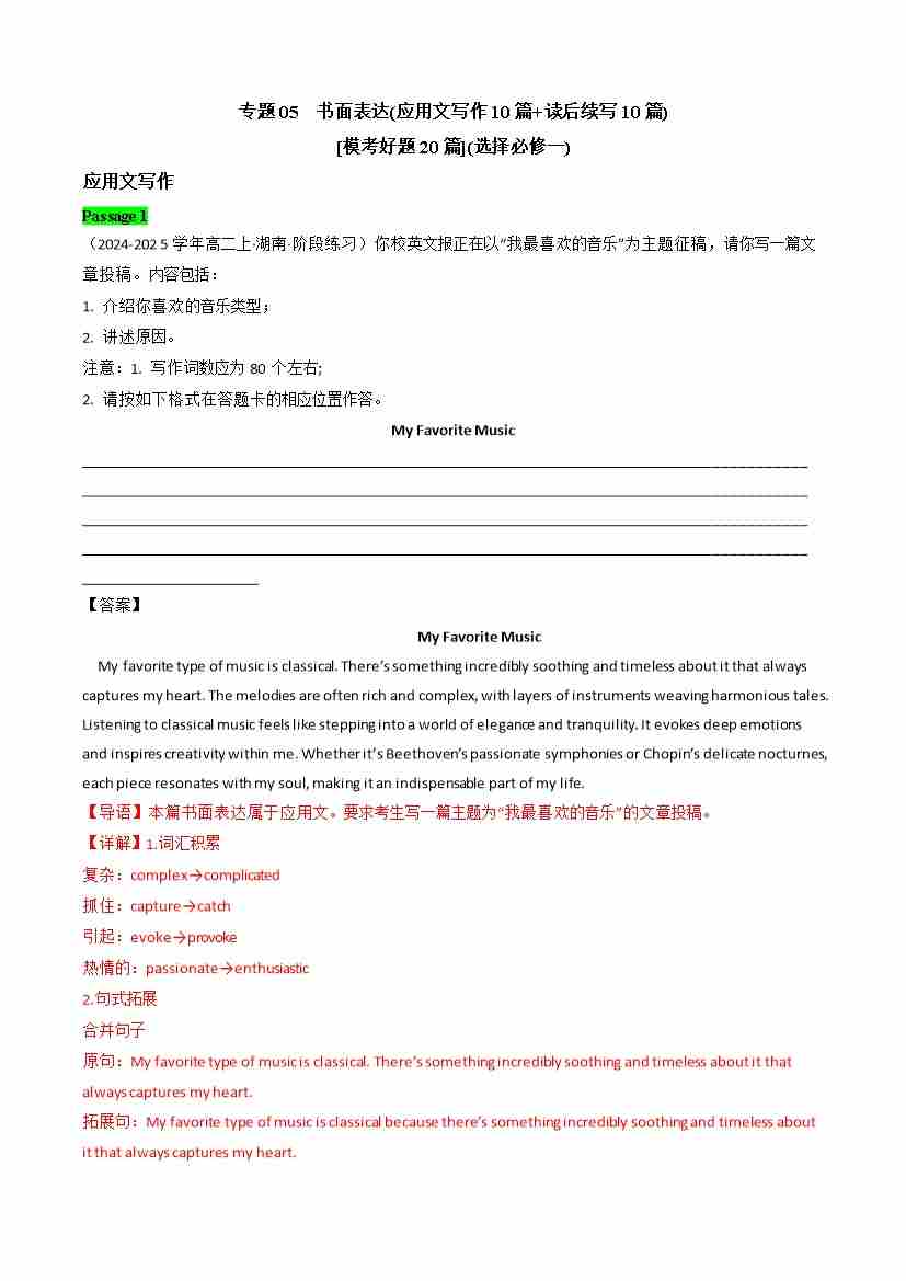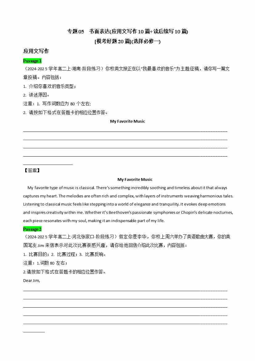 专题05 书面表达(应用文写作 10篇 、读后续写10篇)(模考好题20 篇)(教师版)