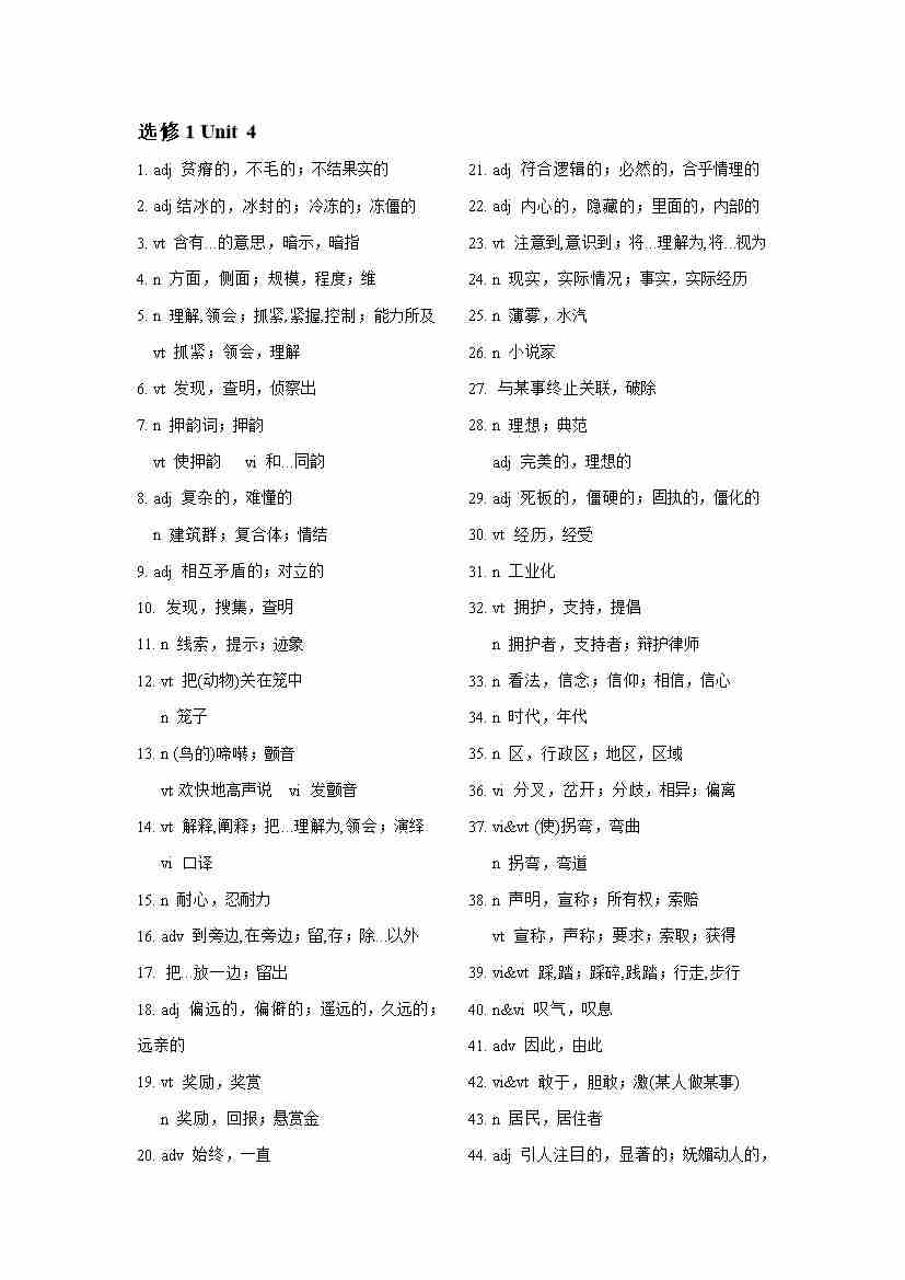 选择性必修第一册Unit4单词表(英译汉、汉译英)