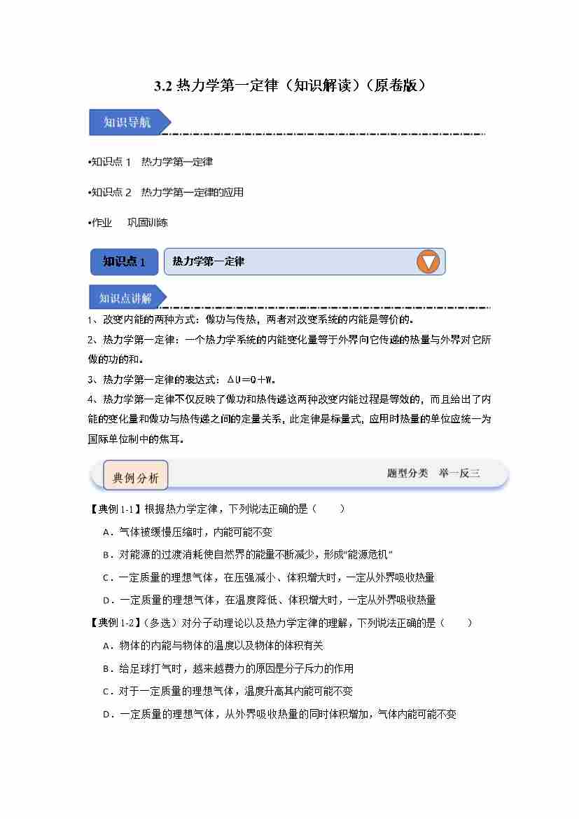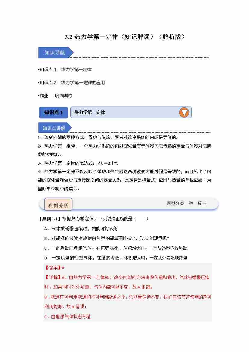 3.2热力学第一定律(知识解读)(学生版)