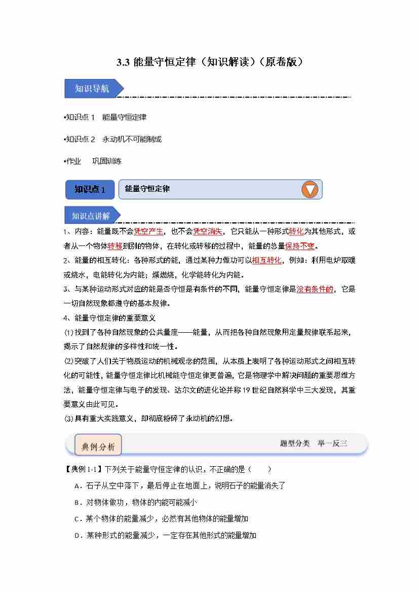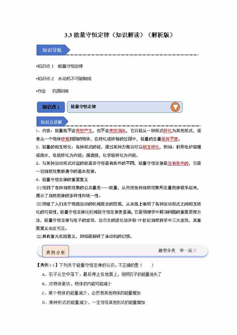 3.3能量守恒定律(知识解读)(教师版)