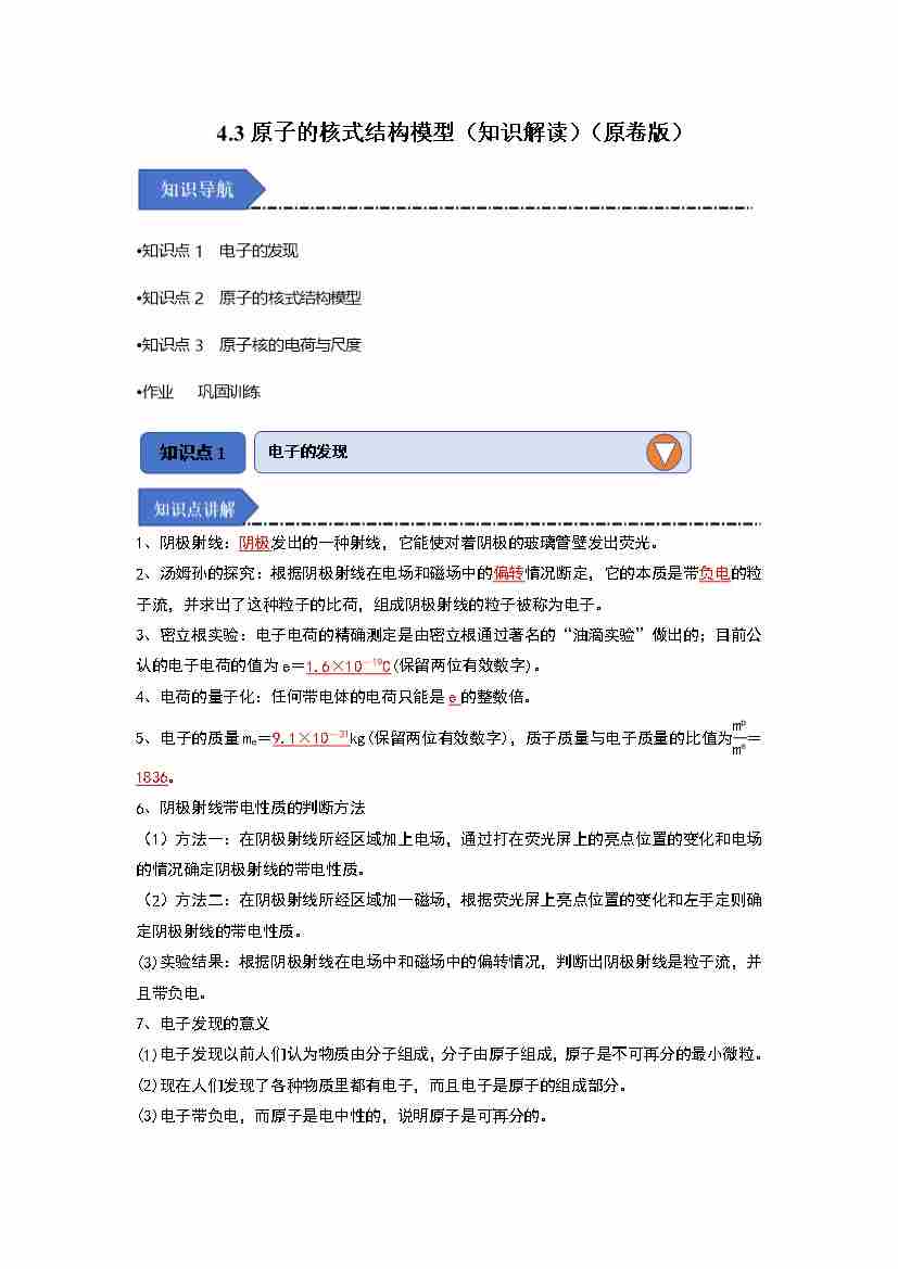 4.3原子的核式结构模型(知识解读)(学生版)