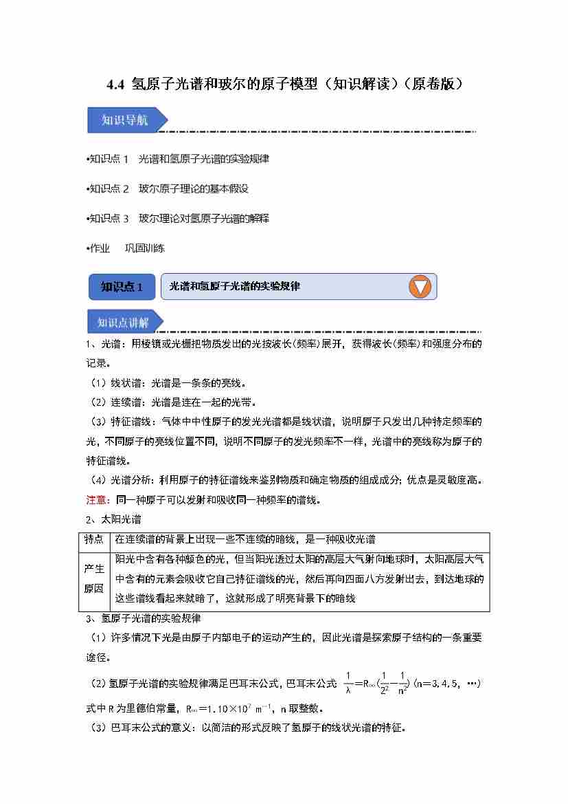 4.4 氢原子光谱和玻尔的原子模型(知识解读)(教师版)