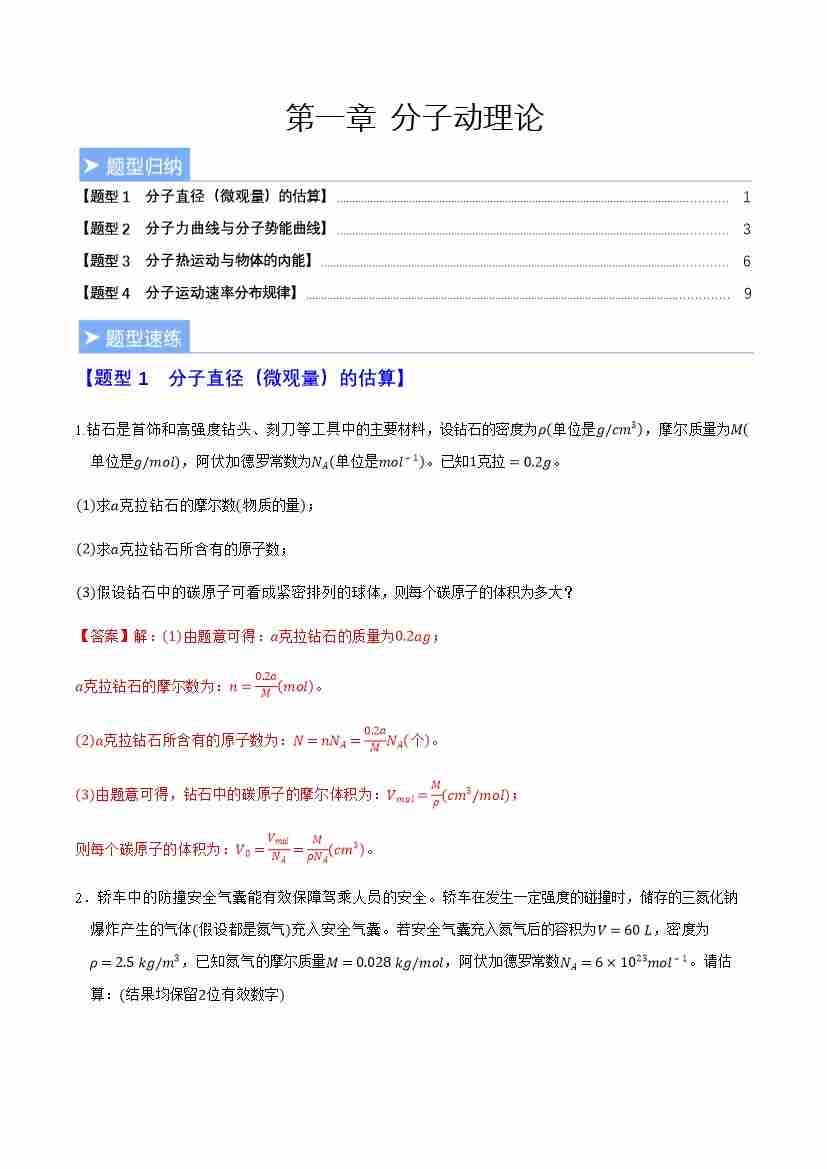 第一章 分子动理论(举一反三重难点训练)(解析版)