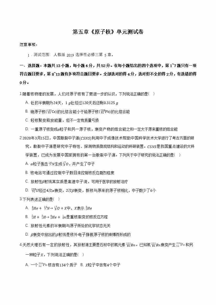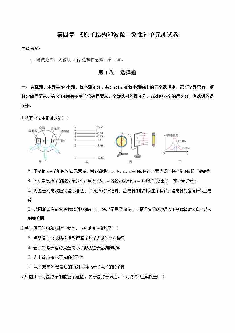 第四章 原子结构和波粒二象性(举一反三单元测试)(原卷版)