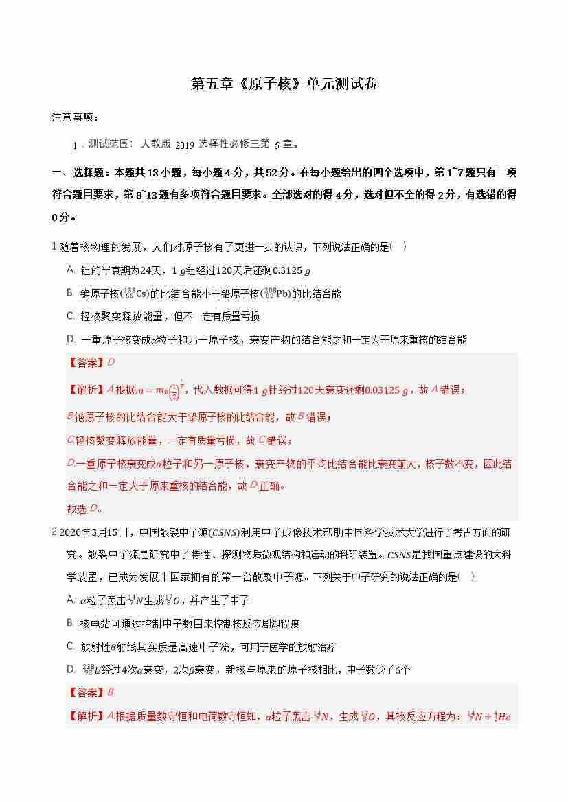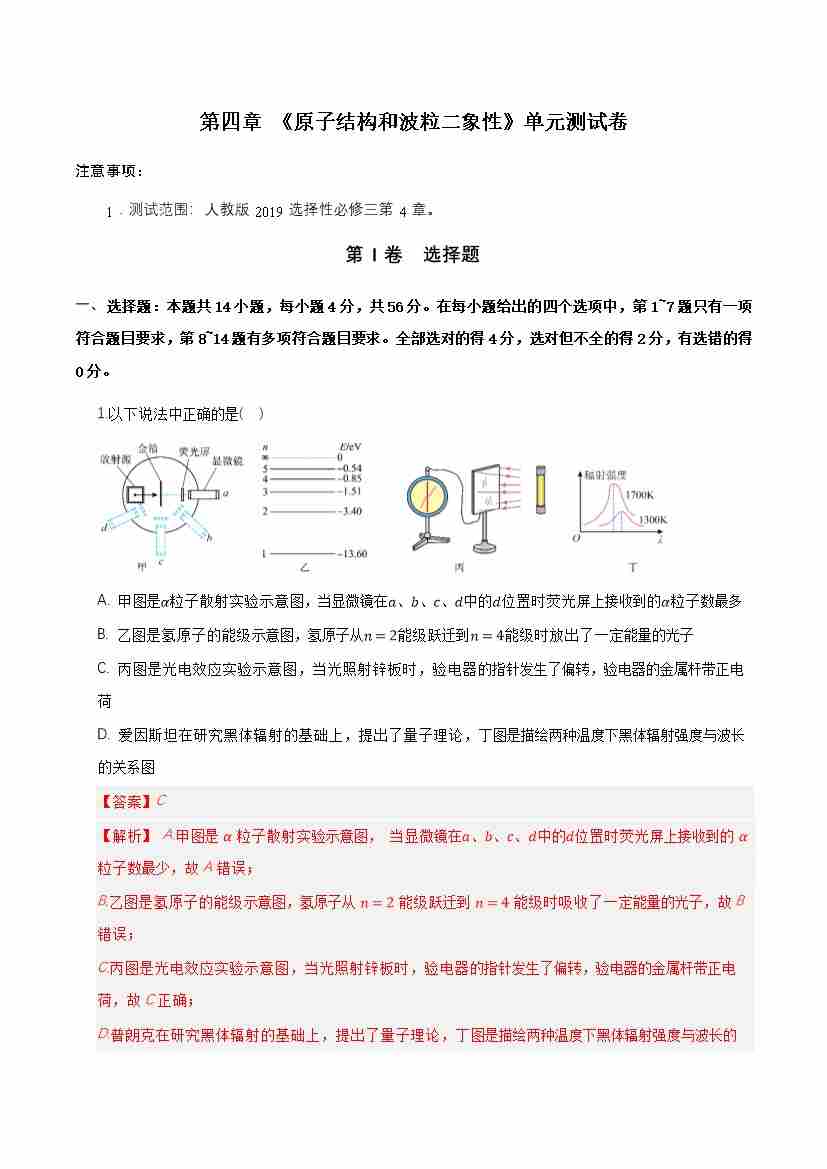 第四章 原子结构和波粒二象性(举一反三单元测试)(解析版)