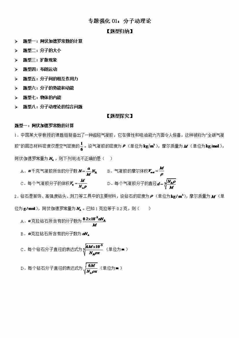 专题强化01:分子动理论 学生版