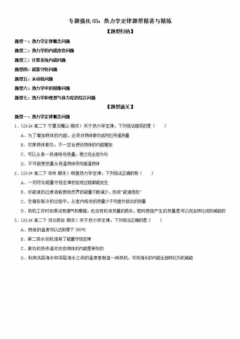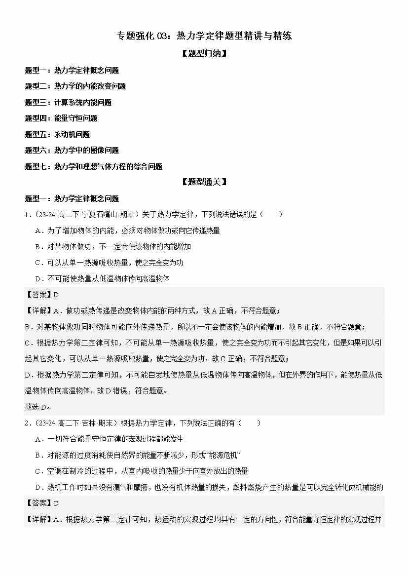 专题强化03:热力学定律题型精讲与精练 学生版