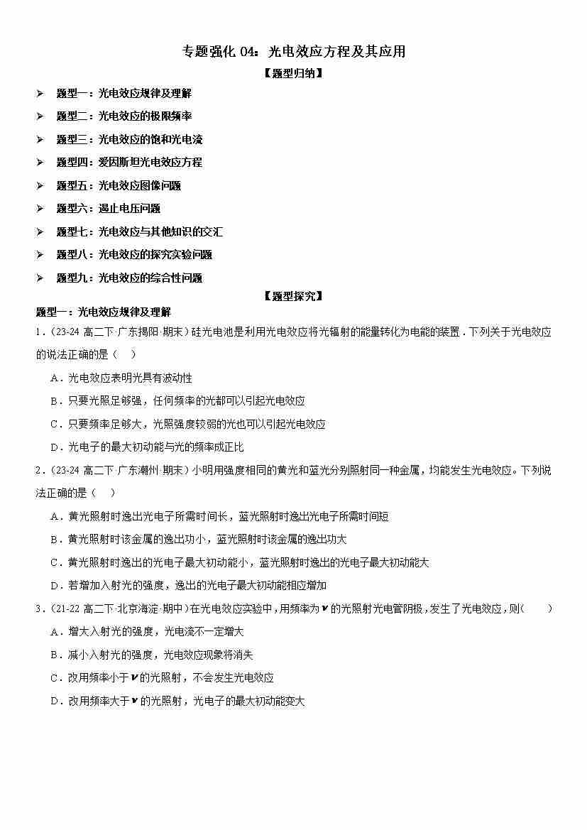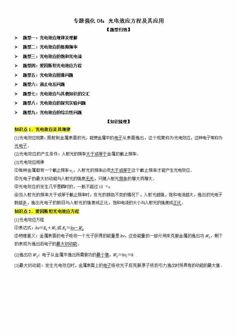 专题强化04:光电效应方程及其应用 学生版