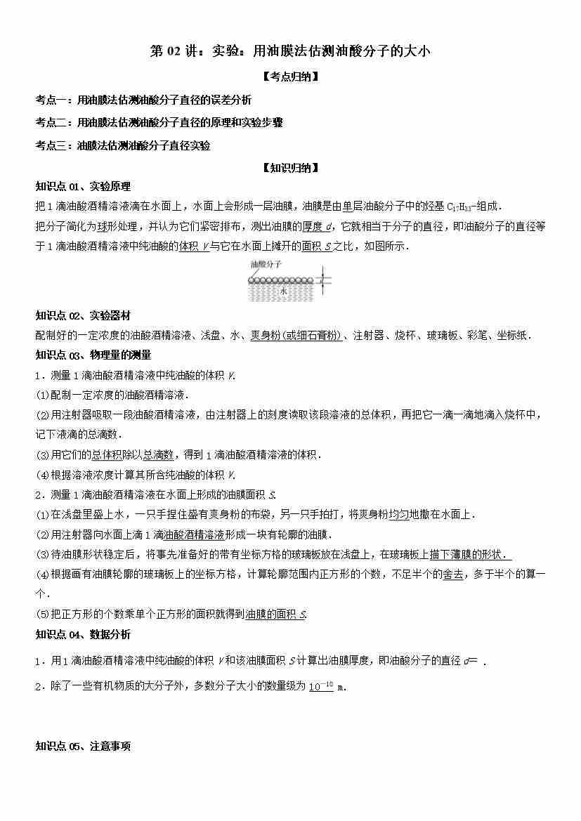 第02讲:实验:用油膜法估测油酸分子的大小 学生版