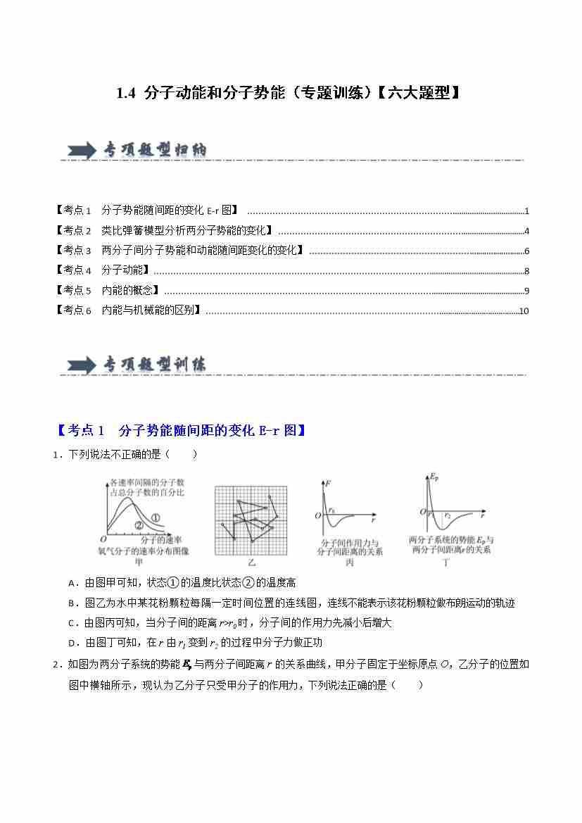 1.4 分子动能和分子势能(专题训练)(六大题型)(学生版)