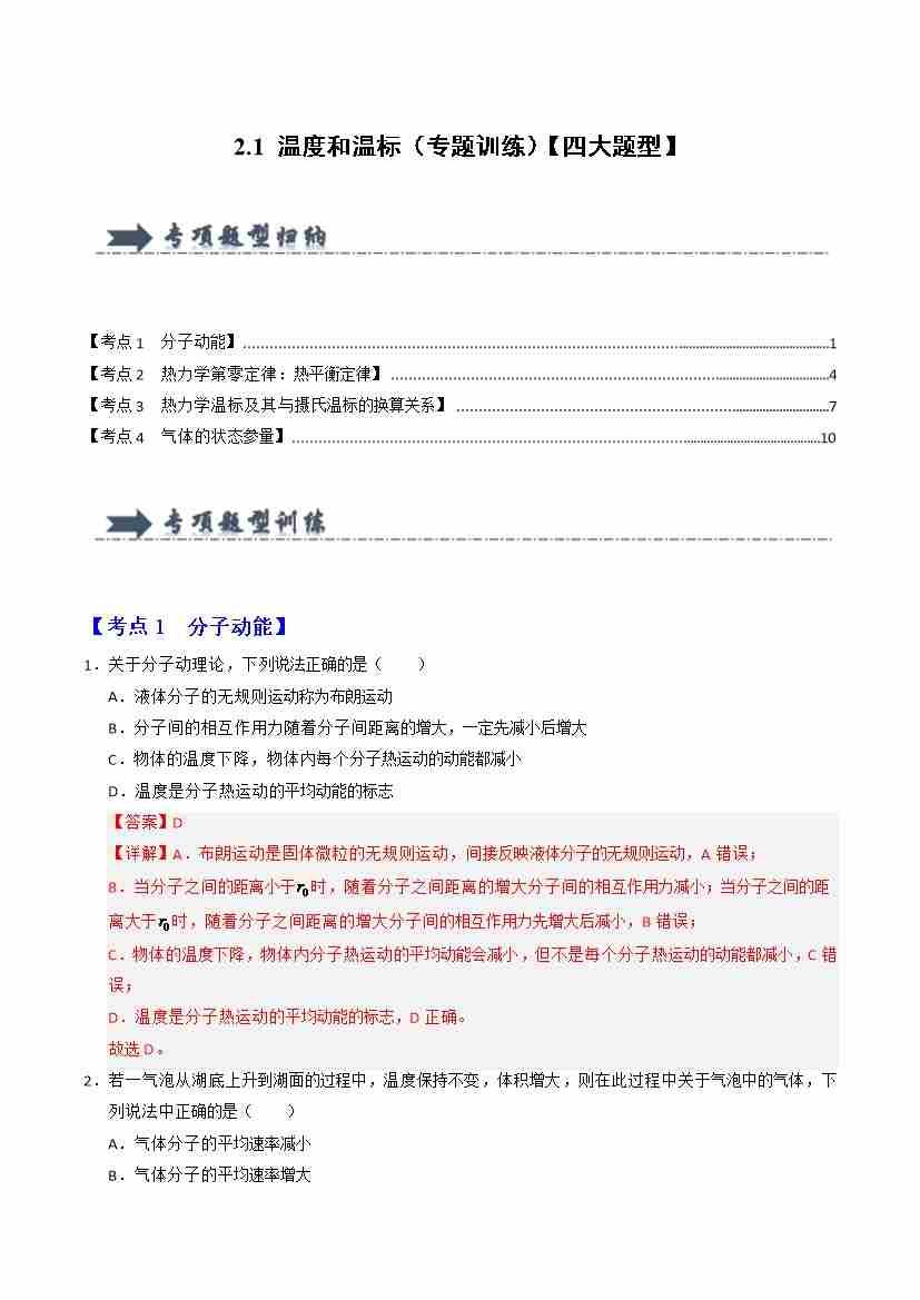 2.1 温度和温标(专题训练)(四大题型)(教师版)