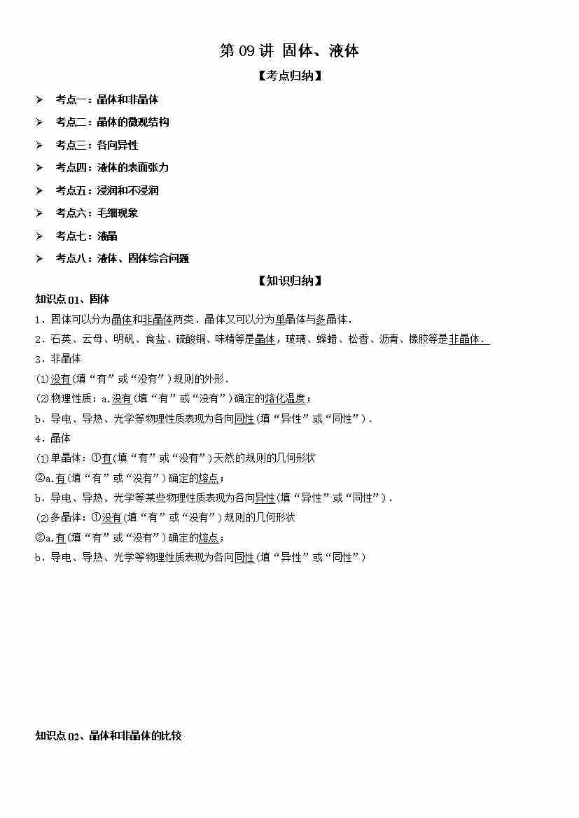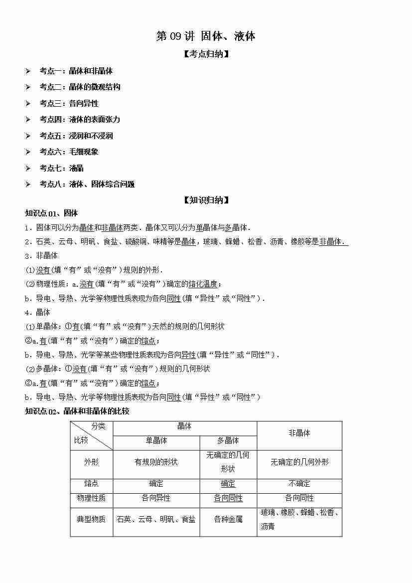 第09讲 固体、液体 学生版