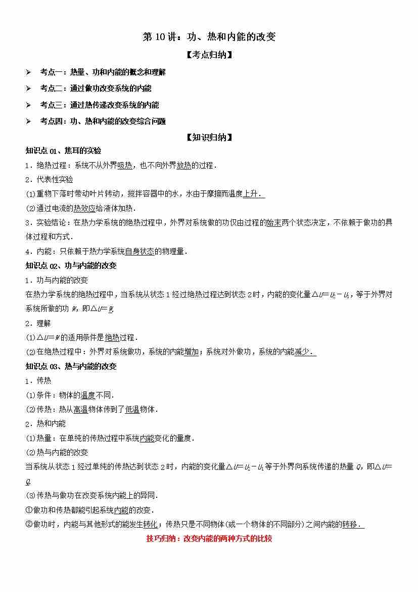 第10讲:功、热和内能的改变 学生版