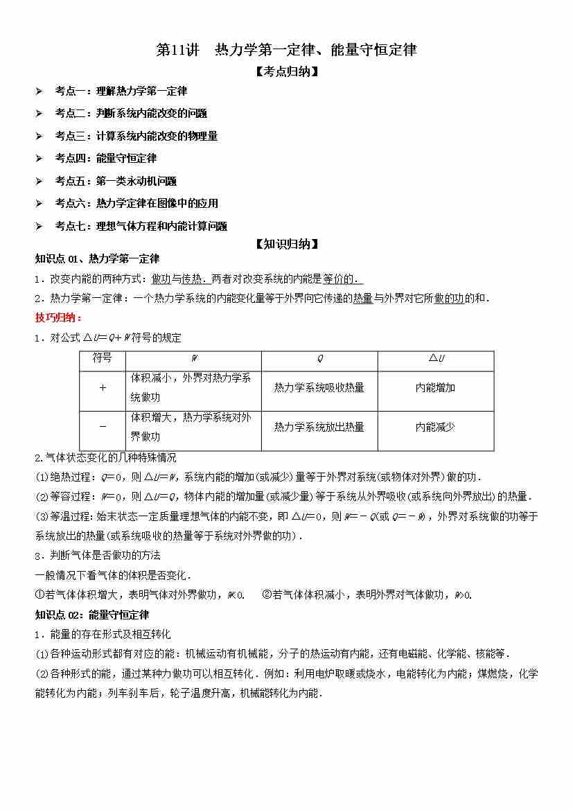 第11讲 热力学第一定律、能量守恒定律 学生版