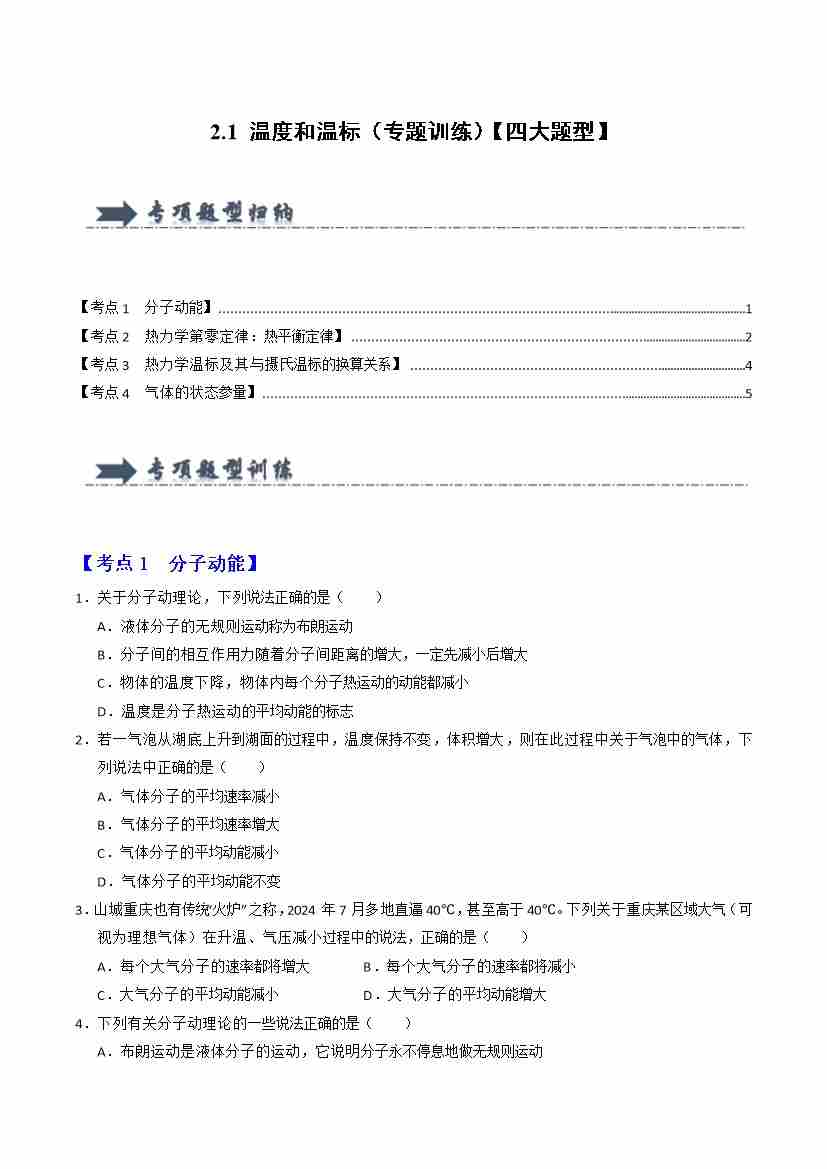 2.1 温度和温标(专题训练)(四大题型)(学生版)