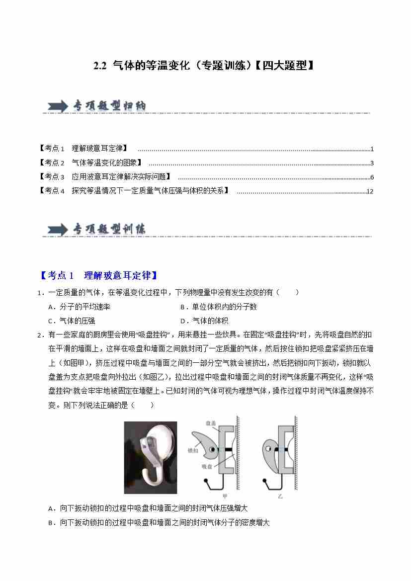 2.2 气体的等温变化(专题训练)(四大题型)(学生版)