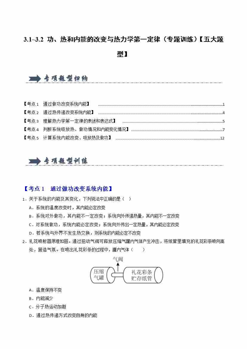 3.1~3.2 功、热和内能的改变与热力学第一定律(专题训练)(五大题型)(学生版)