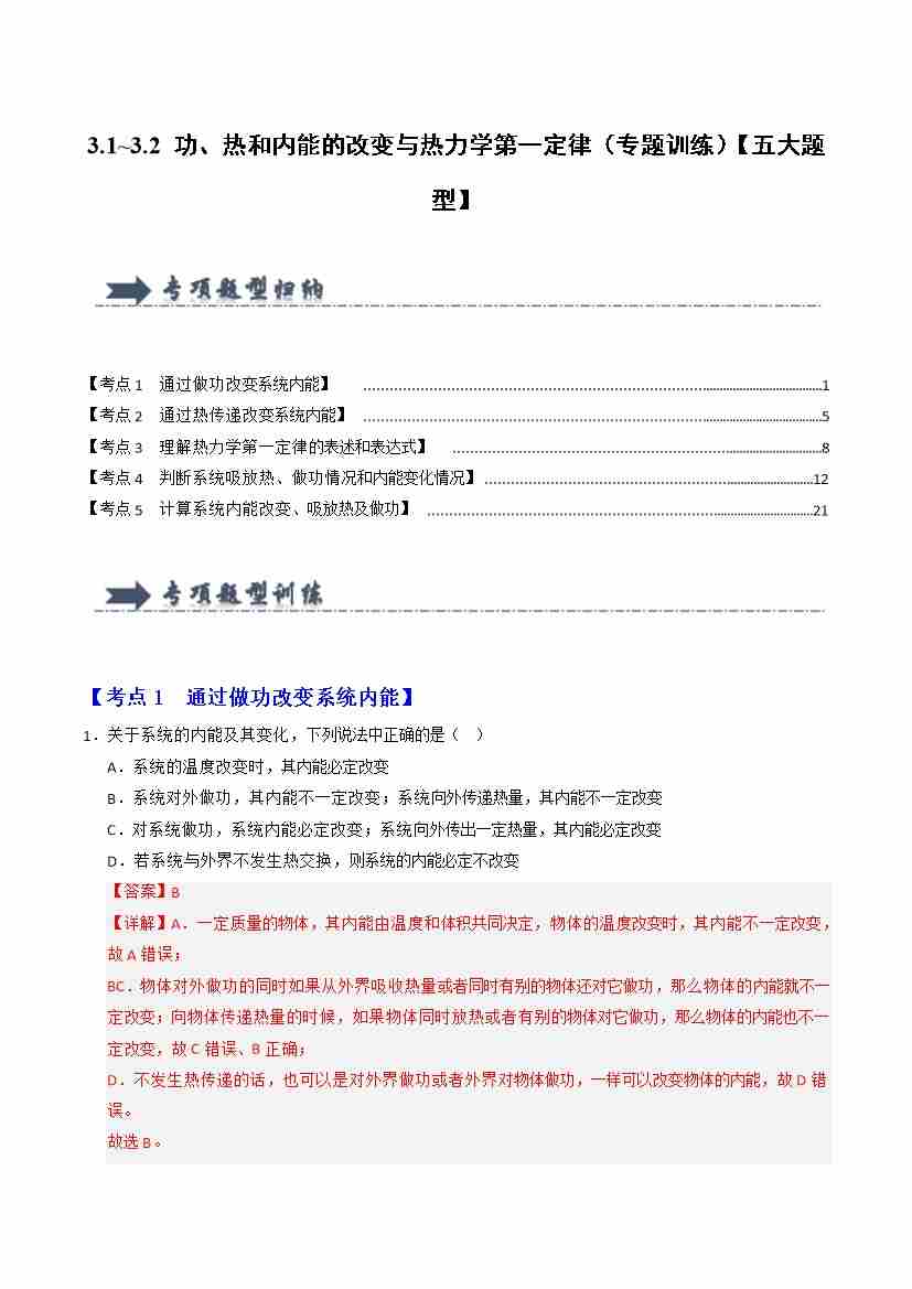 3.1~3.2 功、热和内能的改变与热力学第一定律(专题训练)(五大题型)(教师版)