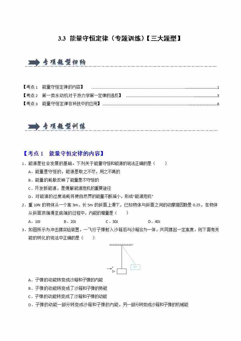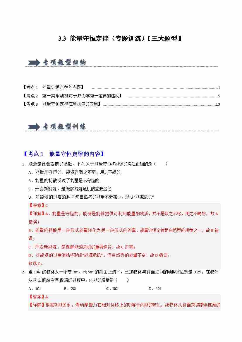 3.3 能量守恒定律(专题训练)(三大题型)(学生版)