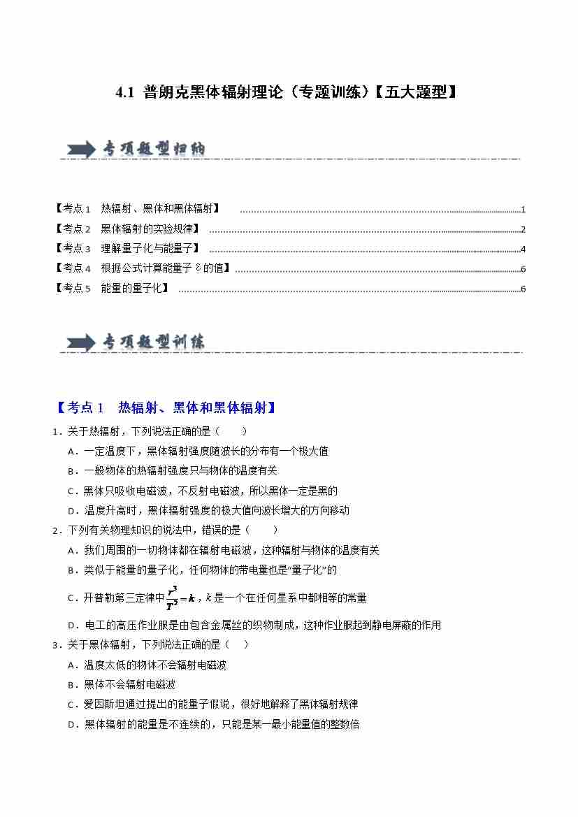 4.1 普朗克黑体辐射理论(专题训练)(五大题型)(学生版)