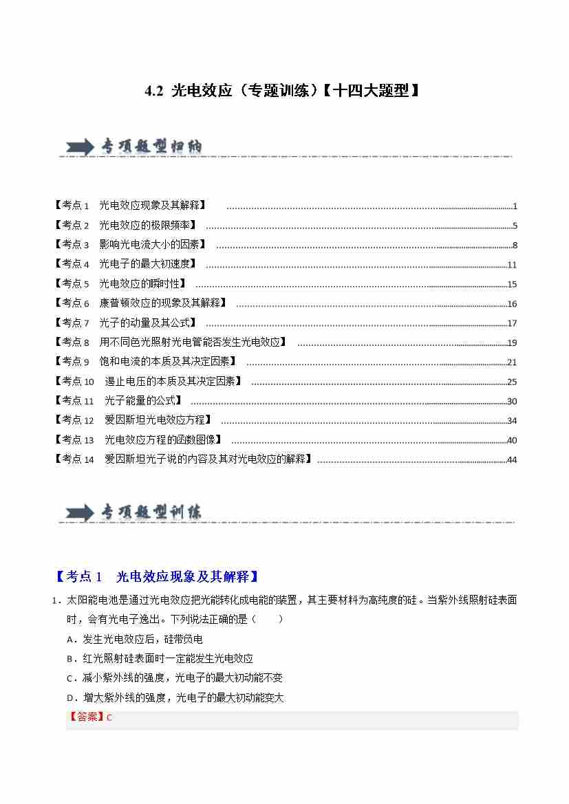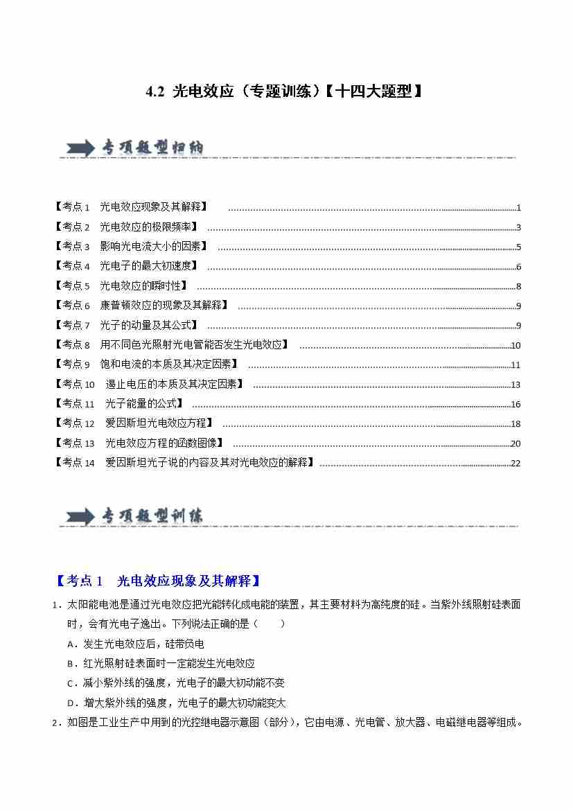 4.2 光电效应(专题训练)(十四大题型)(教师版)