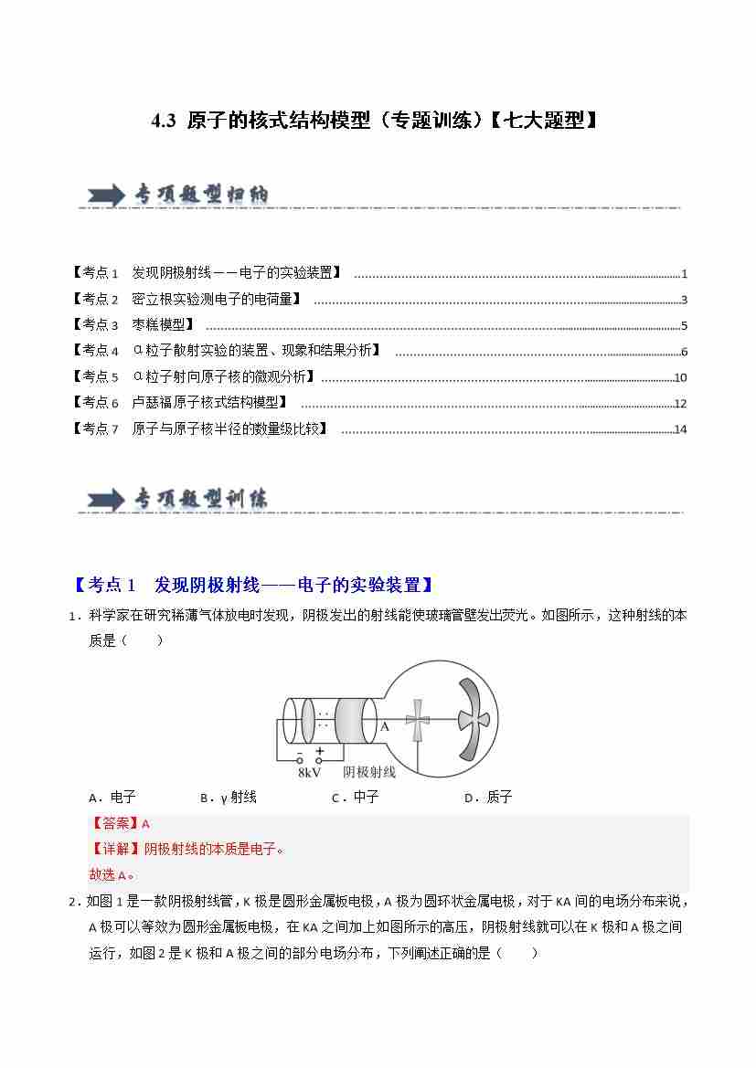 4.3 原子的核式结构模型(专题训练)(七大题型)(教师版)