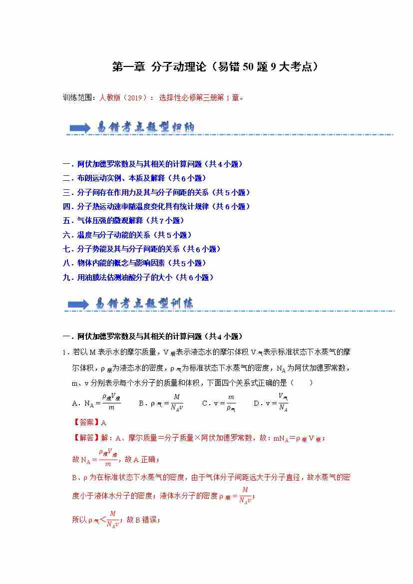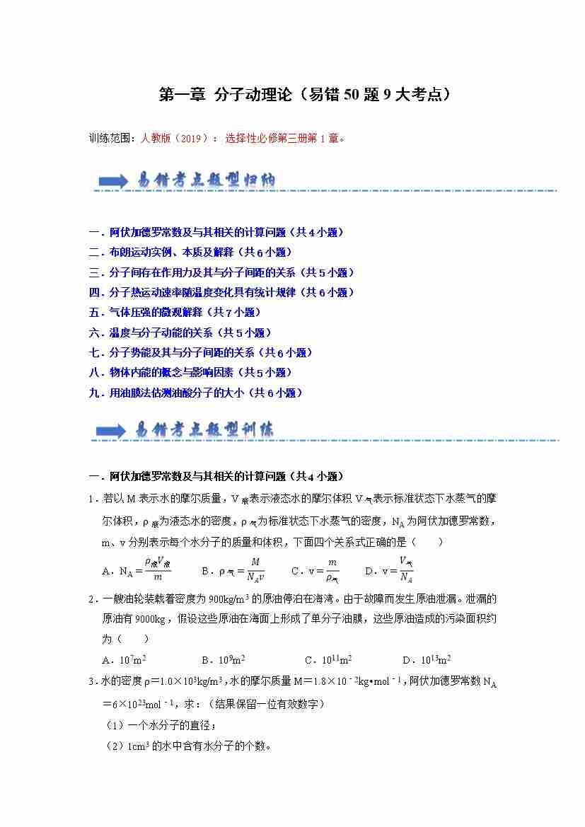 第1章 分子动理论(易错50题9大考点)(教师版)