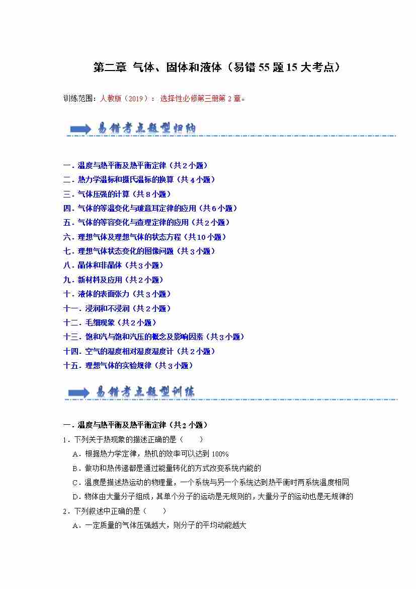 第2章 气体、固体和液体(易错55题15大考点)(学生版)