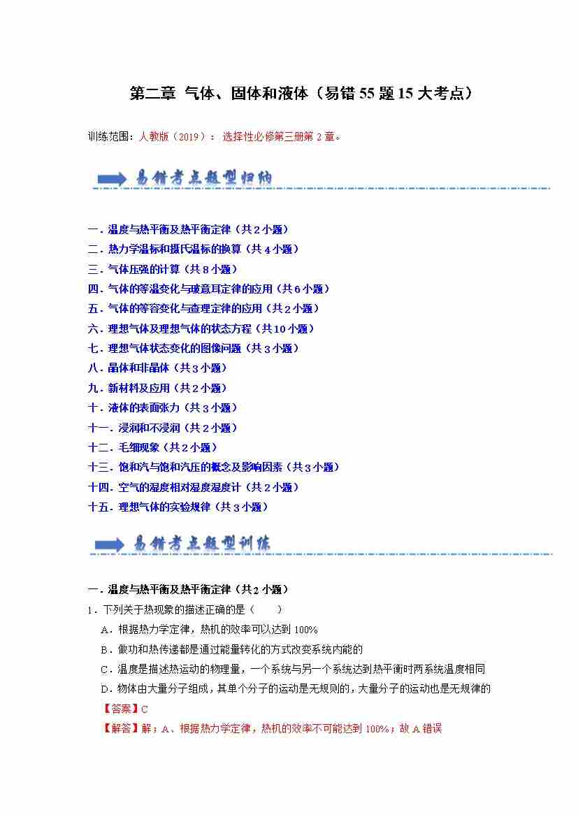 第2章 气体、固体和液体(易错55题15大考点)(教师版)