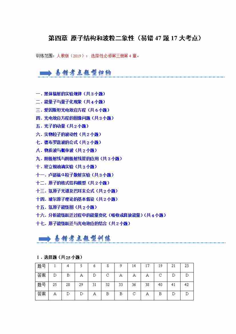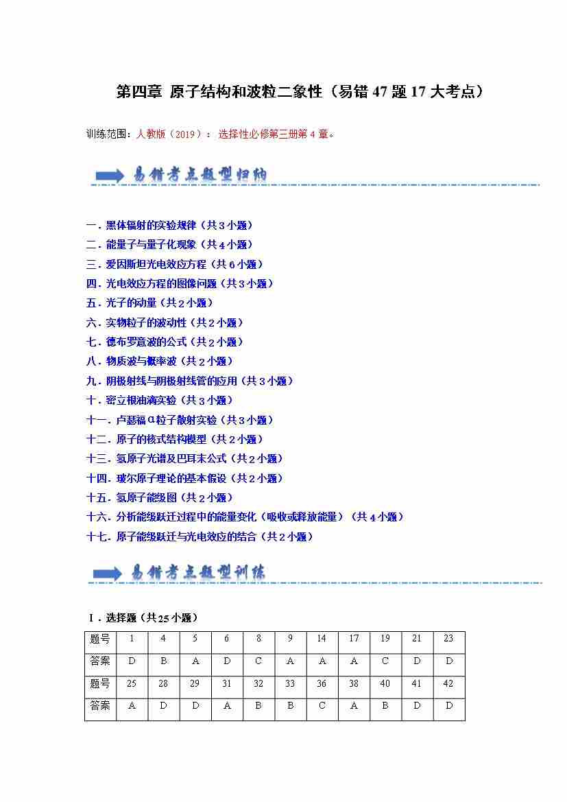 第4章 原子结构和波粒二象性(易错47题17大考点)(学生版)