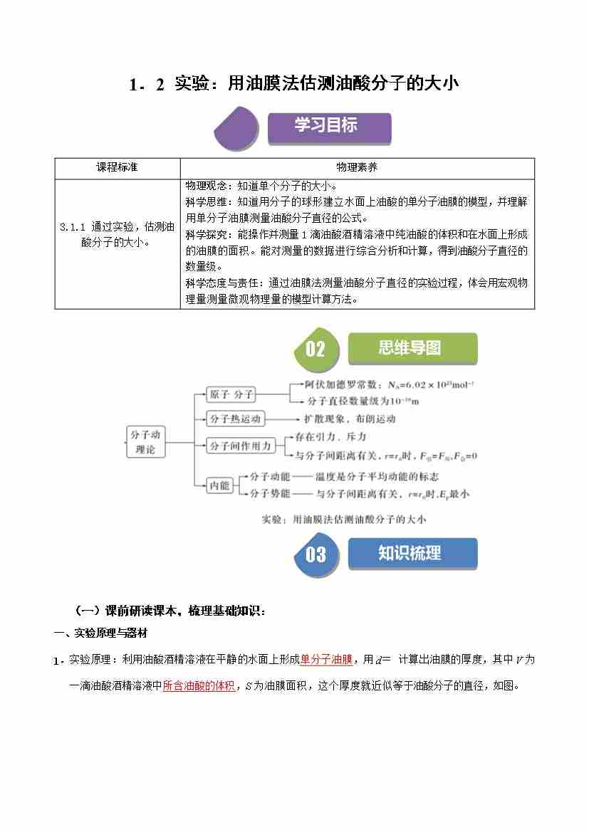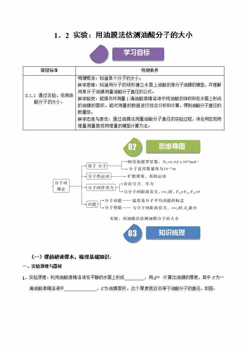 1.2 实验:用油膜法估测油酸分子的大小(学生版)
