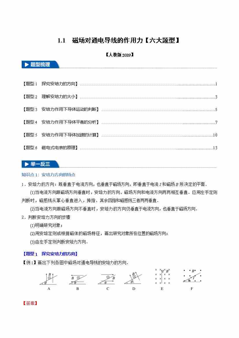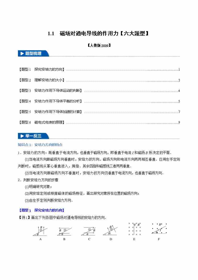 1.1 磁场对通电导线的作用力(举一反三)(六大题型)(学生版)