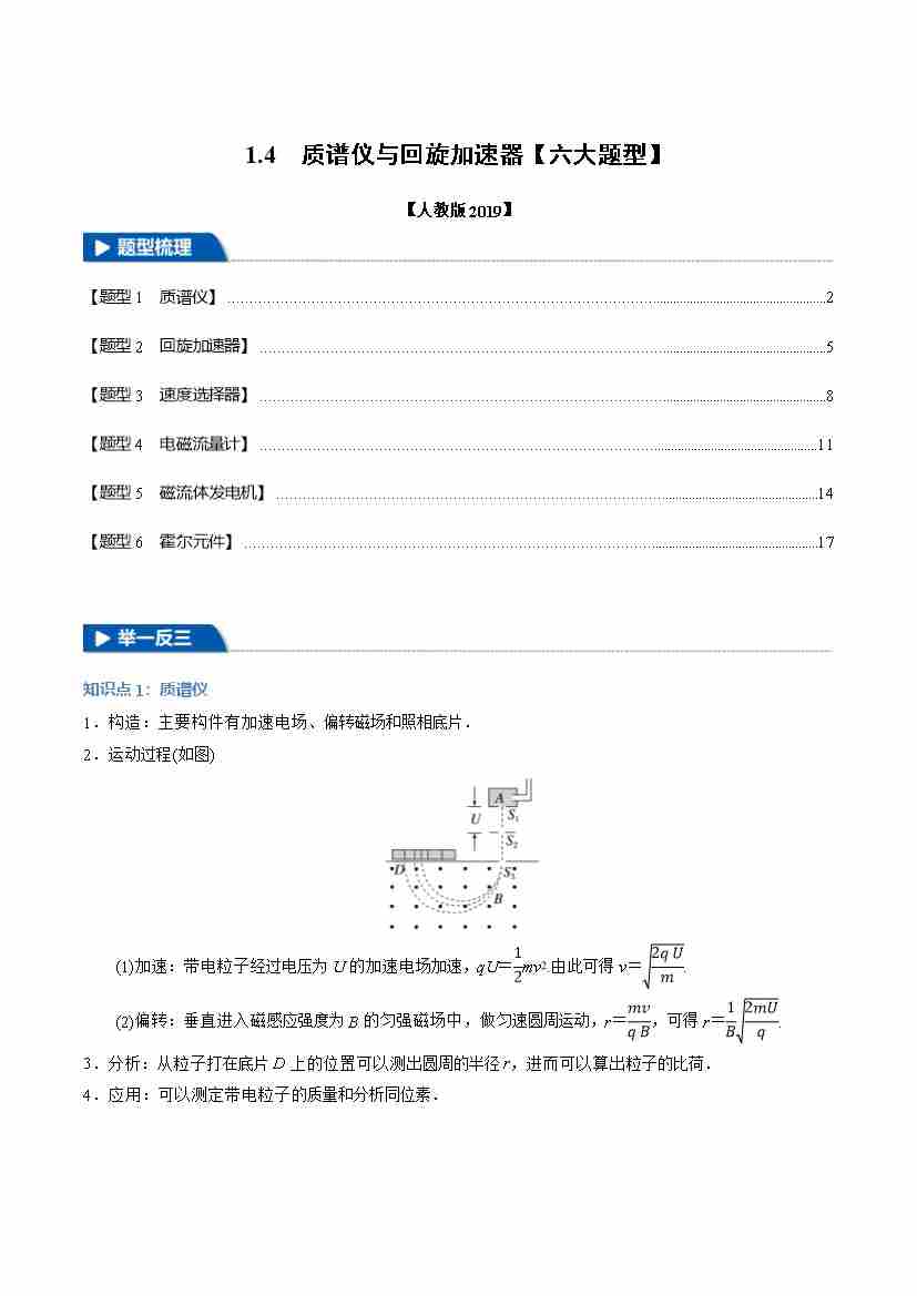 1.4 质谱仪与回旋加速器(举一反三)(六大题型)(教师版)