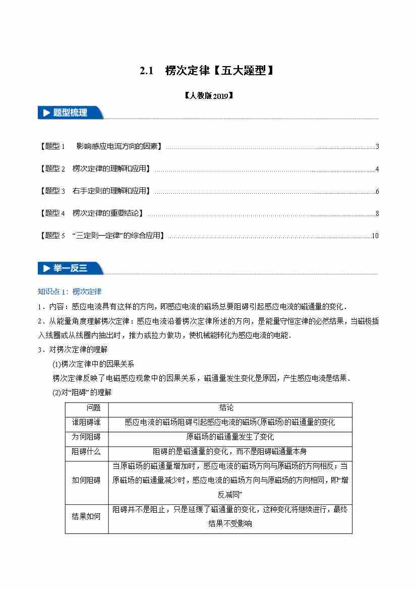 2.1 楞次定律(举一反三)(五大题型)(教师版)