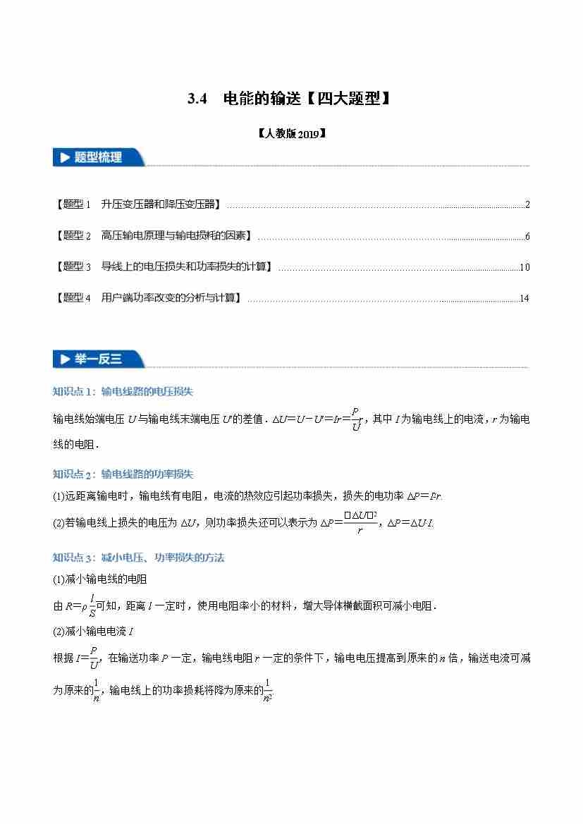 3.4 电能的输送(举一反三)(四大题型)(教师版)