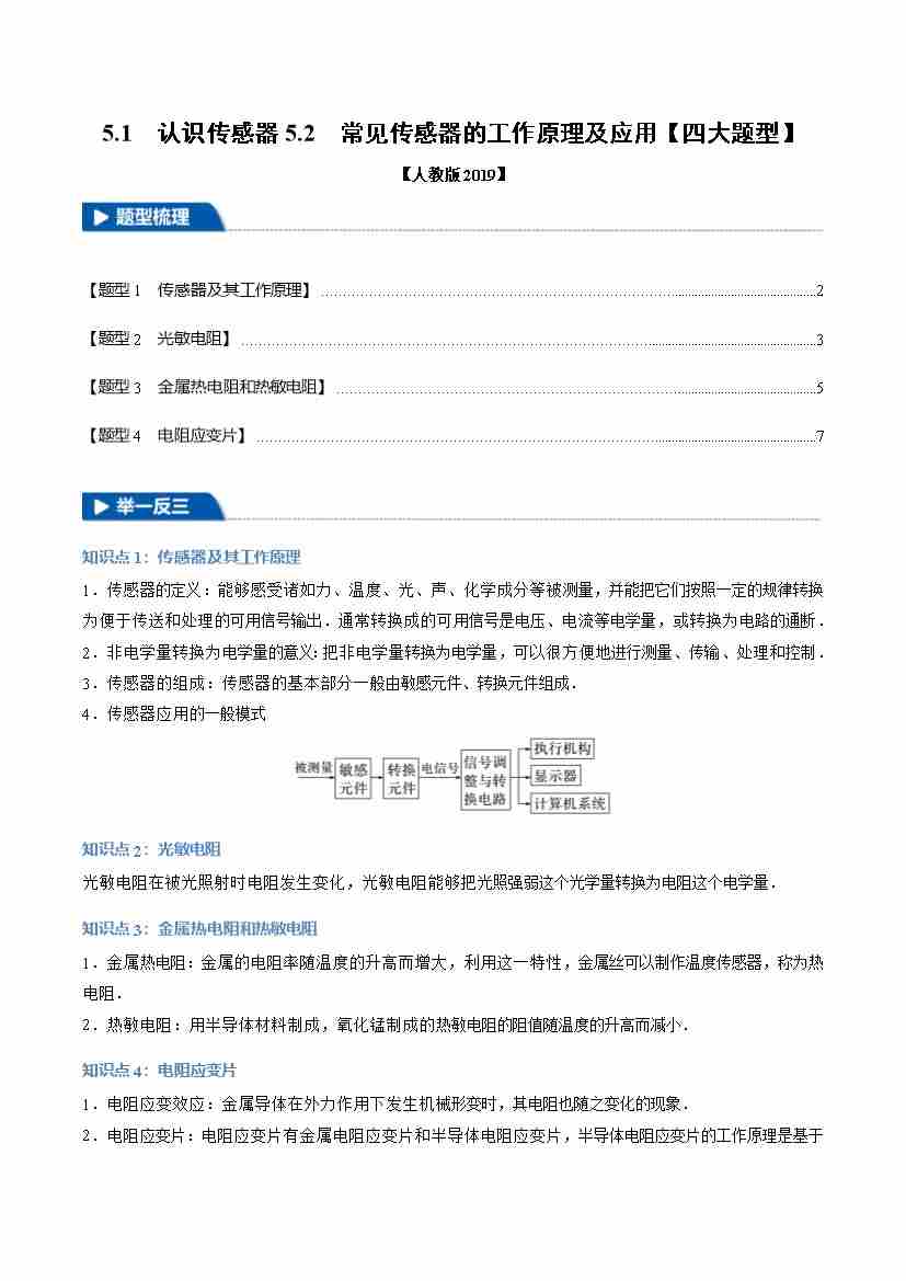 5.1 认识传感器 5.2 常见传感器的工作原理及应用(举一反三)(四大题型)(学生版)
