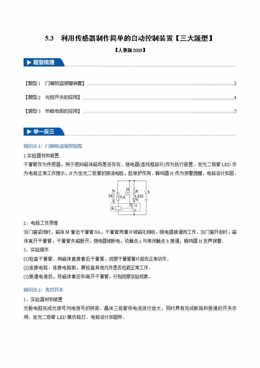 5.3 利用传感器制作简单的自动控制装置(举一反三)(三大题型)(教师版)