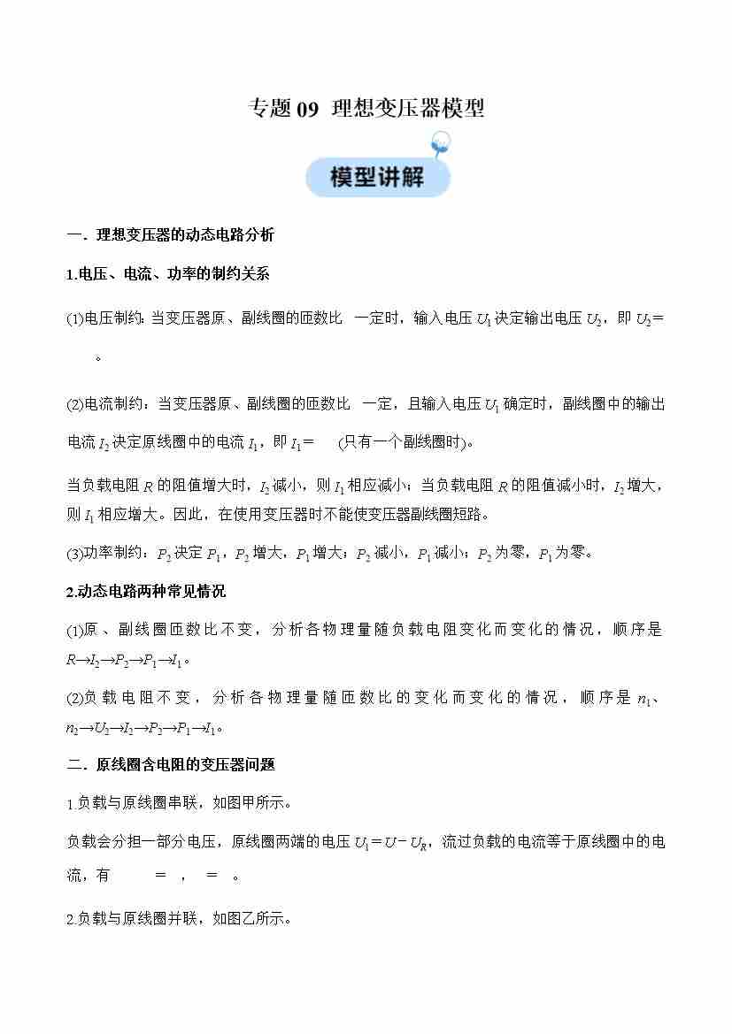 专题09 理想变压器模型(学生版)